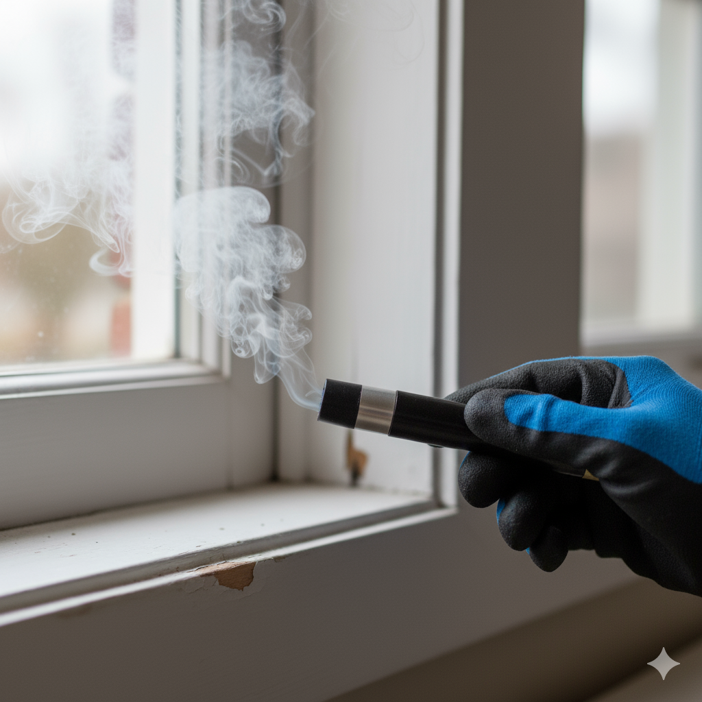 Smoke tracing is used alongside the blower door tester to make hidden leaks visible, showing exactly where unwanted air is entering or escaping your home.